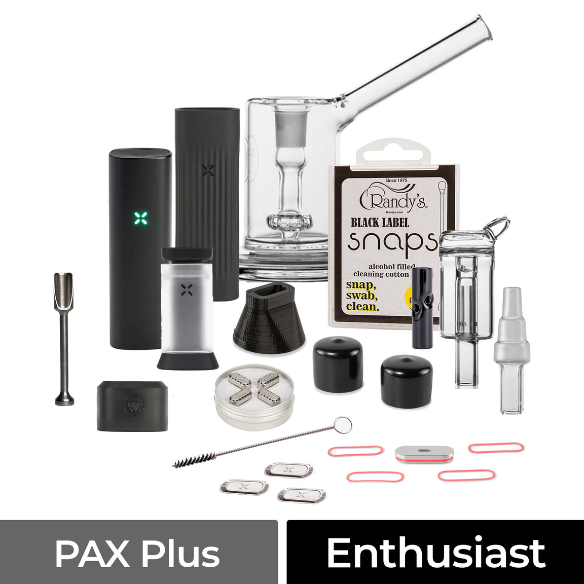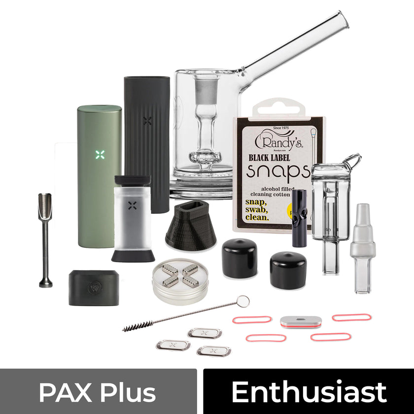 This kit includes the PAX Plus vaporizer, PAX Glass Adapter, a suite of POTV glass accessories, and much more.